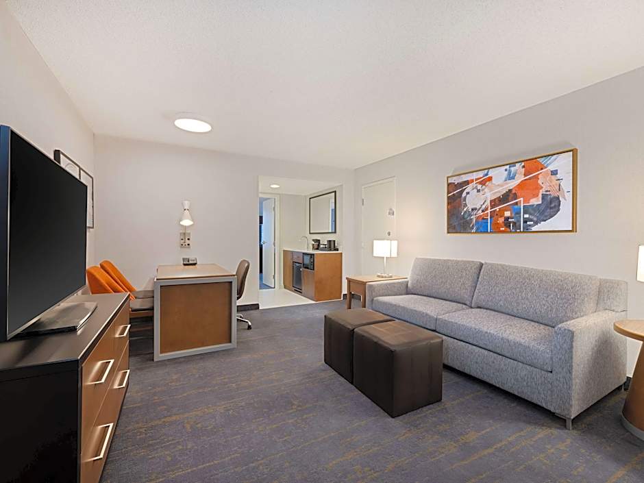 This suite features a flat-screen TV with cable channels, a seating area with a sofa, a microwave, refrigerator, and a work desk.